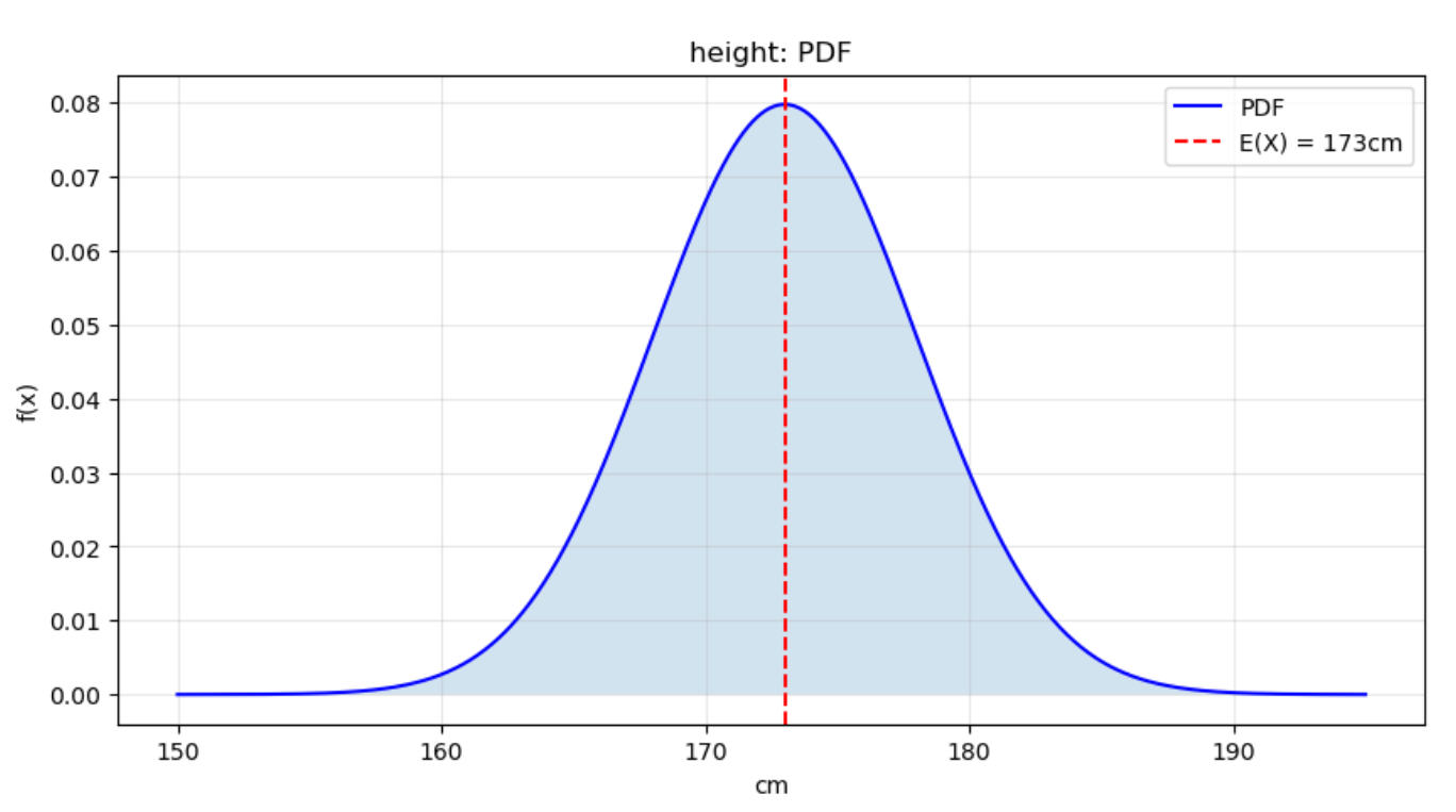 - PDF는 특정한 정확한 값의 확률은 0이고, 대신 구간의 확률을 면적으로 계산합니다.