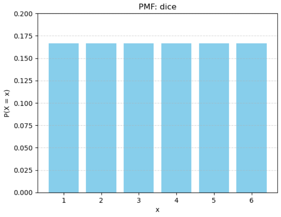 - 각 값의 확률: $P(X = x) = \frac{1}{6}$
