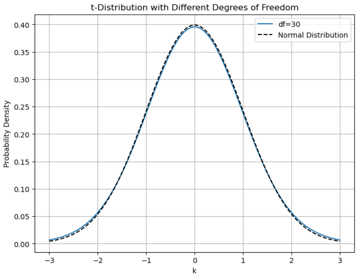 t분포의 자유도가 30이 되니깐 정규분포의 형태와 거의 같아진 모습을 볼 수 있습니다.