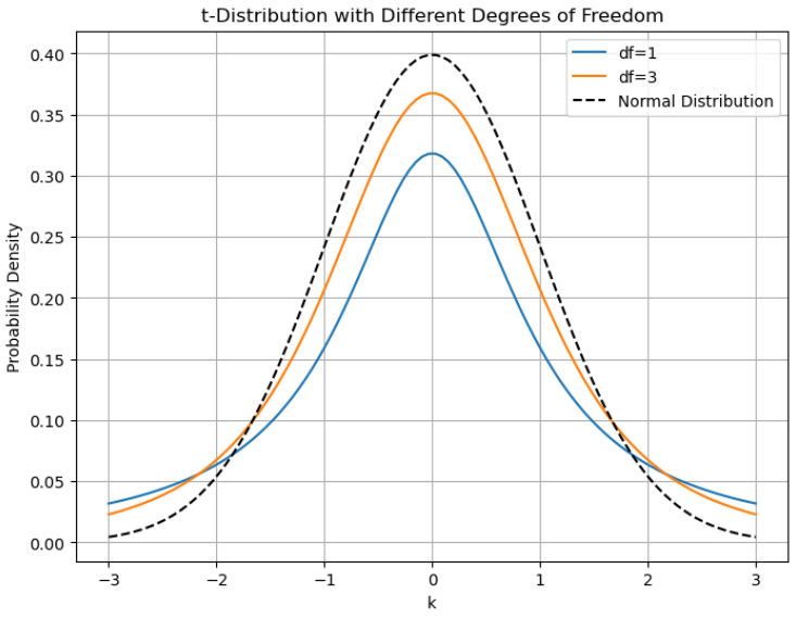 - 자유도(df)에 따라 모양이 달라지며, df가 커질수록 정규분포에 가까워짐